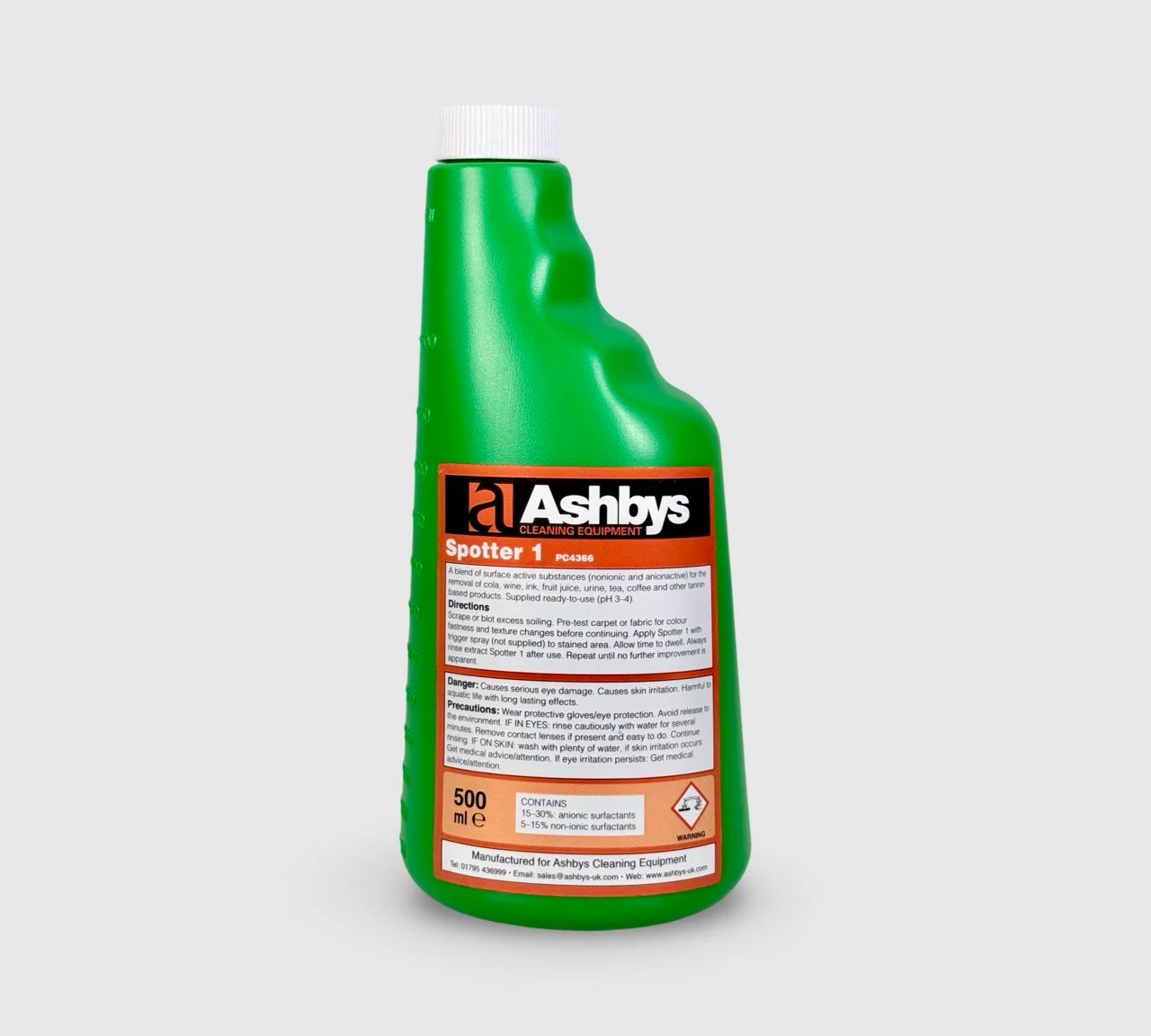 Discover the exceptional stain-tackling power of Ashbys Spotter 1, specifically formulated to target a wide range of water and drink-based stains on carpets, upholstery, rugs, and mattresses. This specially blended solution combines nonionic and anionic active substances to effectively combat challenging stains such as cola, wine, ink, fruit juice, urine, tea, coffee, and other tannin-based products.