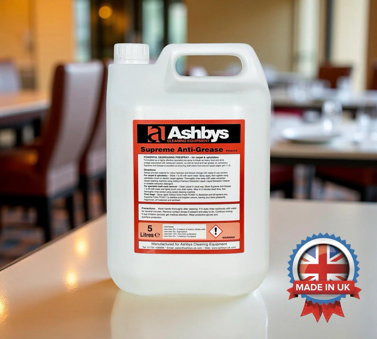 Discover the power of Ashbys Supreme Anti-Grease PC4310, a heavy-duty high pH carpet cleaning pre-spray booster additive. Manufactured in the UK and formulated to enhance the performance of any pre-spray, it effectively breaks up heavy biological grease, food and drink soilage, and eliminates problematic draught marks from carpet edges.